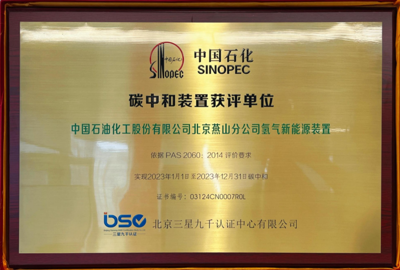 2024年9月2日,北京三星九千認(rèn)證中心有限公司市場總監(jiān)楊曄、外聯(lián)部副經(jīng)理王海燕共同出席了中國石油化工股份有限公司北京燕山分公司氫氣新能源裝置頒證儀式,為氫氣新能源裝置頒發(fā)了“碳中和”評價證書及銅牌。這是中國石化首套“碳中和”示范裝置。